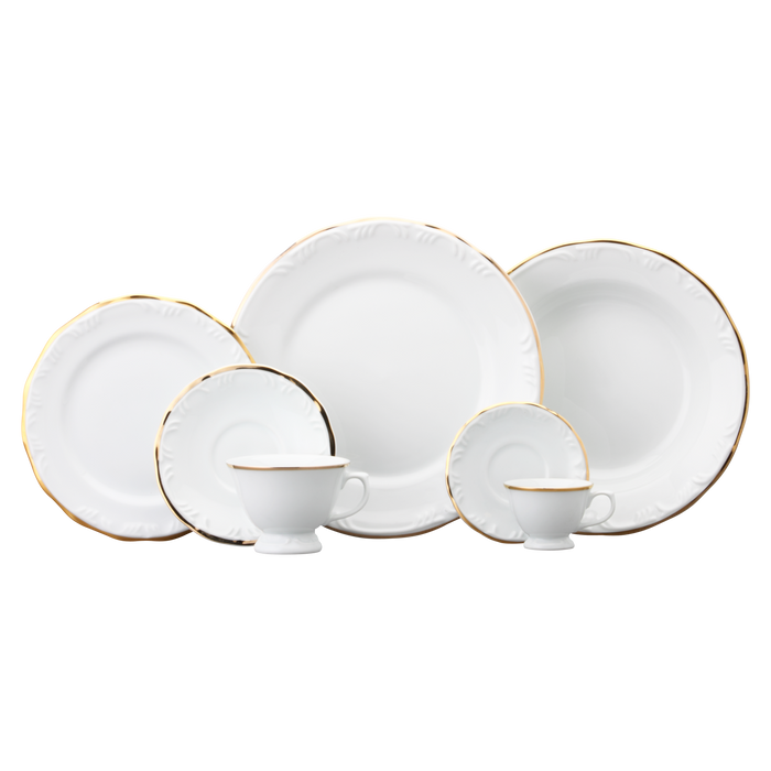 Entertaining and elegant dining is made easy with this complete dining set. This dinnerware set from Porcelana Schmidt is made of fine and durable porcelain, complete with serving pieces. Elegant and attractive dinnerware set, perfect for everyday use or a holiday gathering. This set features a brilliant gold rim border to create a truly rich looking design.
