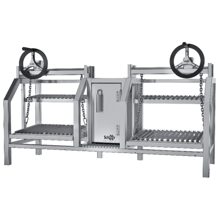 Parrilla Mendoza 903, with front wheel for manual control of the height of the grill. Classic and modern model that allows you to choose the grill according to your barbecue style. The available options are: V-Grill with fat collector or Round Grill (Uruguayan style of roast). In addition, the model has a fire lighter that allows the use of charcoal or firewood. Produced in stainless steel with steering wheel with anti-reverse technology. It will always be opposite the fire lighter.